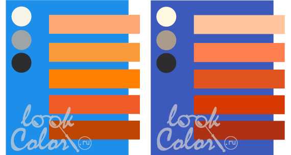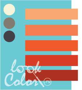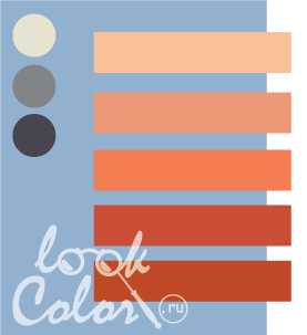 Серо-голубой сочетается с оранжевым: светло-оранжево-персиковым, кораллово-персиковым, оранжево-коралловым, медным, темно-оранжевым. Основа: молочный, серый, антрацитовый.