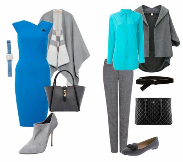 Хотите, чтобы другие увидели в Вас профессионала своего дела, серьёзного и знающего, используйте серый и голубой в изделиях строгого и лаконичного кроя. Это может быть платье-футляр в сочетании со светло-серым пальто или блуза с брюками или юбкой. В любом случае, размер цветового пятна голубого цвета должен зависеть от его насыщенности. Во втором комплекте блуза бирюзовая, – этот цвет более активный, чем голубой. Поэтому его процент в ансамбле меньше.