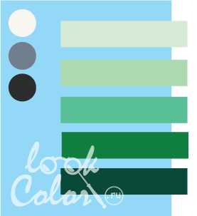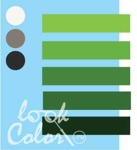 Светло-голубой сочетается с теплым зеленым: салатовым, киви, мхом, зеленью, темно-зеленым. Основа: кремовый, серое дерево, мокрый асфальт.