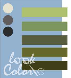 Серо-голубой сочетается с теплым зеленым: авокадо, лягушкой в обмороке, хаки, болотно-зеленым, коричнево-зеленым. Нейтральные оттенки: слоновая кость, мышиный, мокрый асфальт.