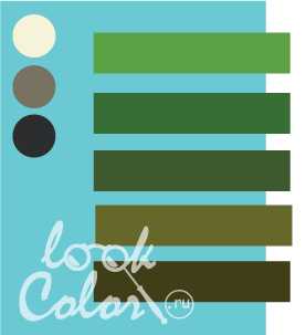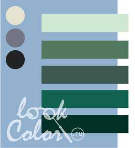 Зелено-голубой сочетается с теплым зеленым: травяным, зеленью, лиственно-зеленым, болотно-зеленым, коричнево-зеленым. Базовые: сливочный, серо-оливковый, мокрый асфальт.