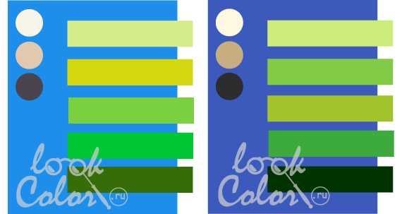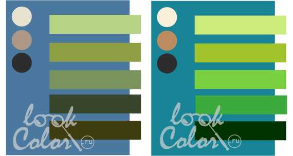 Сочетание теплого зеленого и голубого – это легкий контраст по температуре, который вносит изюминку в комбинацию родственных тонов. Они могут быть как свежими — с желто-зеленым и сочной зеленью, так и задумчивые – с болотными и коричнево-зелеными тонами.