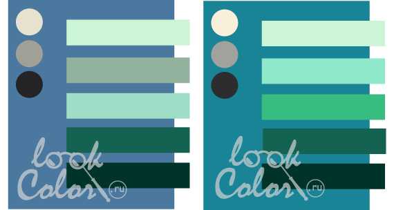 Зелено-голубой сочетается с холодным зеленым: цветом воды, ментоловым, цветом Келли, изумрудным, холодным темно-зеленый. Базовые: сливочный, серый, мокрый асфальт.