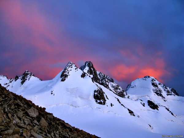 Вершины Джангитау и Катынтау (обе выше 5000 м) в великой Безенгийской стене. Внизу крупнейший ледник Кавказа — Безенгийский. Перепад высоты от ледника до вершин — более 2 км: четыре Останкинских башни. Если вы стояли у основания Останкинской башни и смотрели на ее верхушку, увеличьте ощущения вчетверо и добавьте громадных ледников для более мурашечных ощущений!