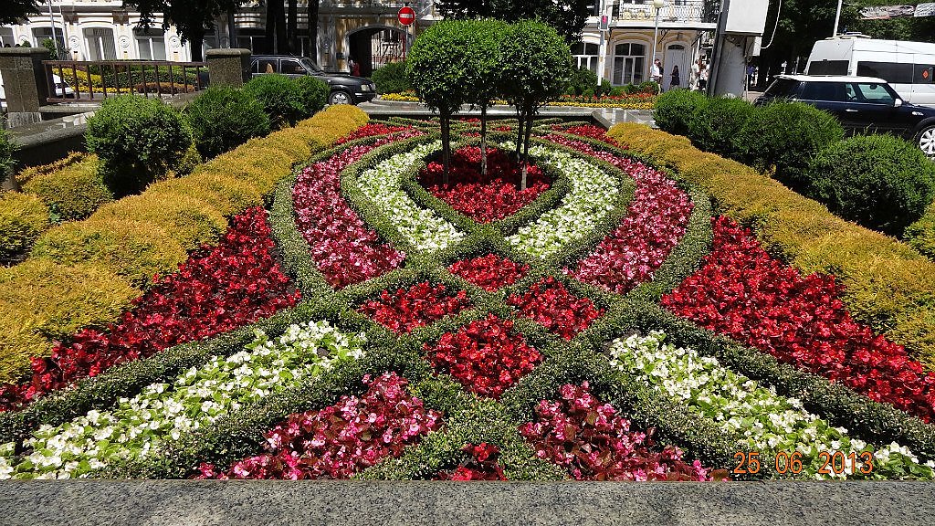 Ранней весной распускаются пеларгонии, бегонии и петунии, в начале лета эстафету принимают флоксы, бархатцы, васильки и ноготки, а до наступления первых заморозков клумбу украшают астры, календула и лаватера.