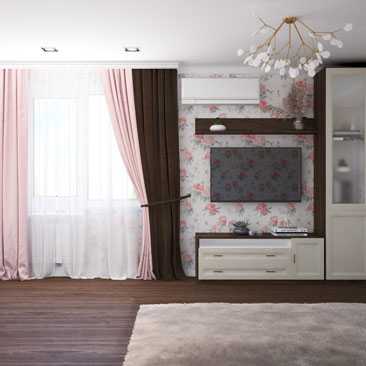 Нежные занавески в сочетании с розовыми чехлами делают интерьер гостиной нежным и уютным, что в сочетании с темной мебелью дает прекрасный эффект, а освещение разделяет гостиную на зоны.