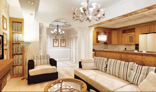 - Арки и полуперегородки. Достаточно интересный вариант визуального разделения пространства, поскольку как арка, так и полуперегородка реально комнату не делят, хотя и обозначают границу между функциональными зонами. Полуперегородка – это как бы выступающий из стены незначительный кусок нарочито оформленной перегородки, которая призвана отделить одну зону от другой. Арка – это архитектурный элемент, который также обозначает границу функциональных зон в гостиной-кухне.