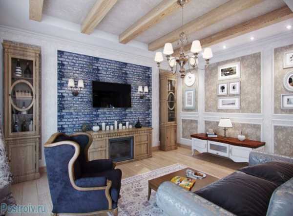 При желании можно интерьер гостиной в стиле Прованс дополнить разными оттенками синего цвета: от василькового до бирюзового тона.