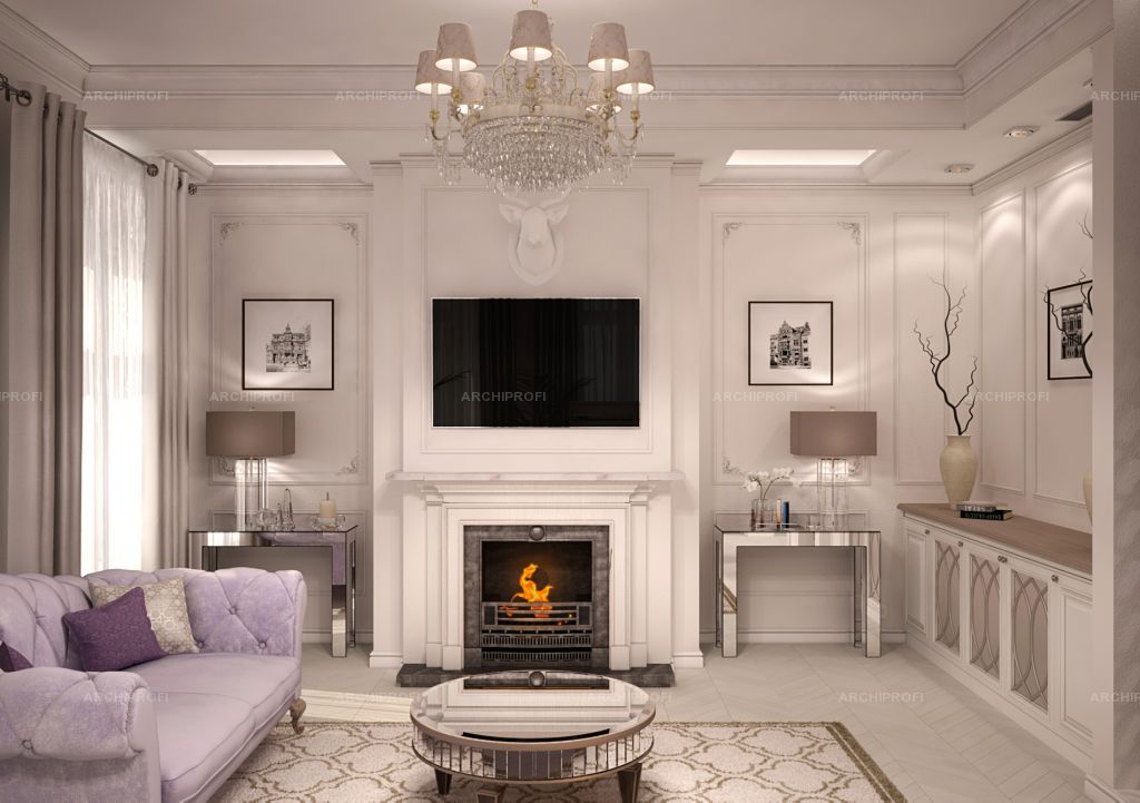 На фото сиренево-бежевое и белое сочетание цветов в гостиной в классическом стиле.