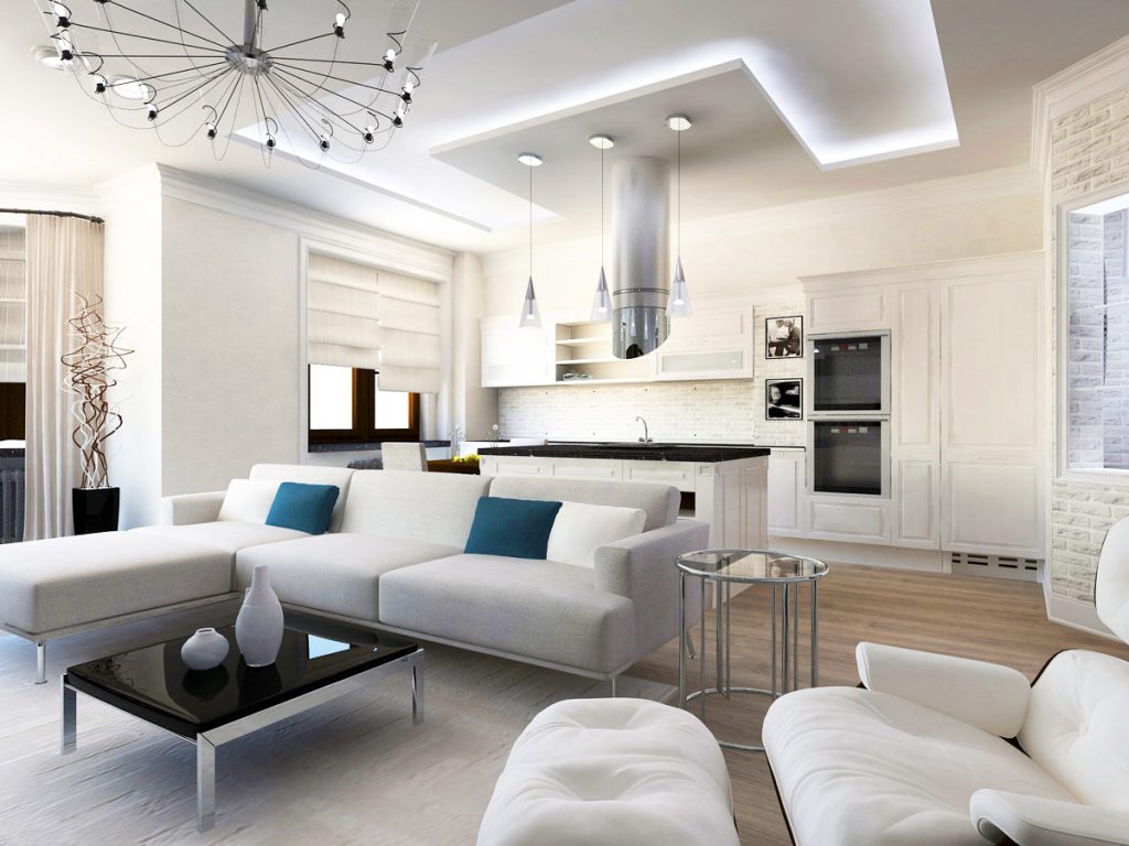 Если планируете выделить зону кухни, то можно использовать прием возведения небольшого подиума или же многоуровневые конструкции на потолке. Другой вариант — размещение стеклянной перегородки. Низкая или даже во всю высоту помещения, она привнесет своего рода современный «барьер» между гарнитуром кухни и зоной отдыха. В отделке пола и фартука можно использовать внешне схожий материал, в то время как для зоны времяпровождения и отдыха уместно применить более эстетические материалы — ковролин, паркет, ламинат.
