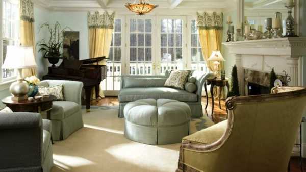Для декора подойдет резьба, позолота, цветочные росписи. В интерьере могут присутствовать шкафы с открытыми полками, комоды с большим количеством ящиков, а также металлическая фурнитура. Хорошо в гостиной будут смотреться буфет, камин и кресло-качалка.