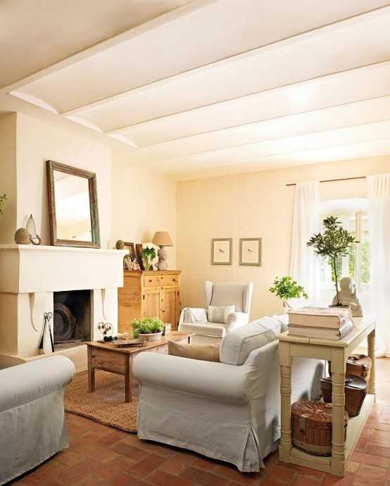 Потолок отделывается обычной штукатуркой и окрашивается в белый цвет. Очень популярны балки, расположенные вдоль или поперек гостиной и окрашенные в белый цвет. Главное чтобы балки производили впечатление грубоватых деревянных брусьев.