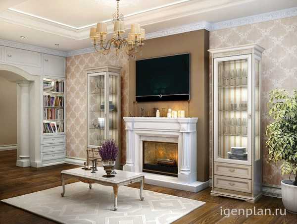 Если лепнина используется в отделке камина, то гостиная тоже должна иметь подобные детали, чтобы подчеркнуть единый стиль и завершенность интерьера.