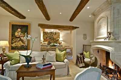 Гостиная в стиле прованс с камином подчёркивает старину, и должна говорить о том, что здесь выросло несколько поколений. Она должна внушать уважение. Поэтому мебель должна быть состарившейся. Это можно достичь искусственно или приобрести старинную.
