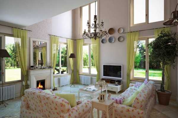 Напротив камина отлично будут смотреться плетеные кресла с вышитыми подушками и пледом, чайный столик с вазочкой конфет или печенья. Гостиная в прованском стиле должна быть светлой, поэтому темные шторы днем неприемлемы, хорошо иметь два варианта – тяжелые гардины и прозрачный тюль.