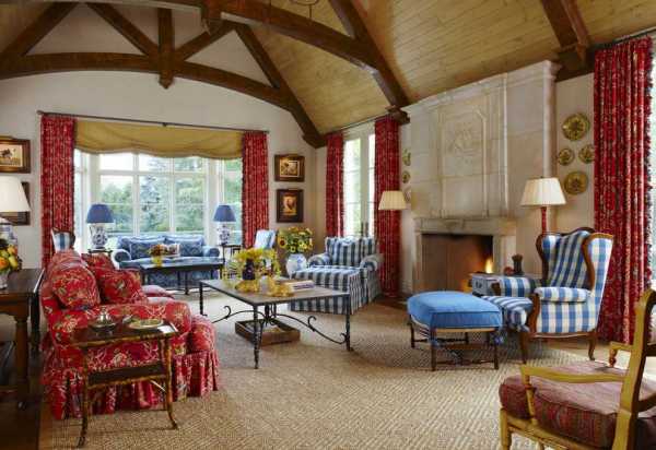 Все должно выглядеть так, словно в этой гостиной прошла жизнь не одного поколения. Здесь нет места искусственному лоску и идеальным глянцевым поверхностям. Стены обрабатываются грубой штукатуркой, дощатые полы – матовыми лаками, а полы, вымощенные плиткой – имитируют каменную кладку. Неидеальный потолок подпирают грубо обтесанные балки, и это единственная деталь, где допускается использование темного оттенка древесины.