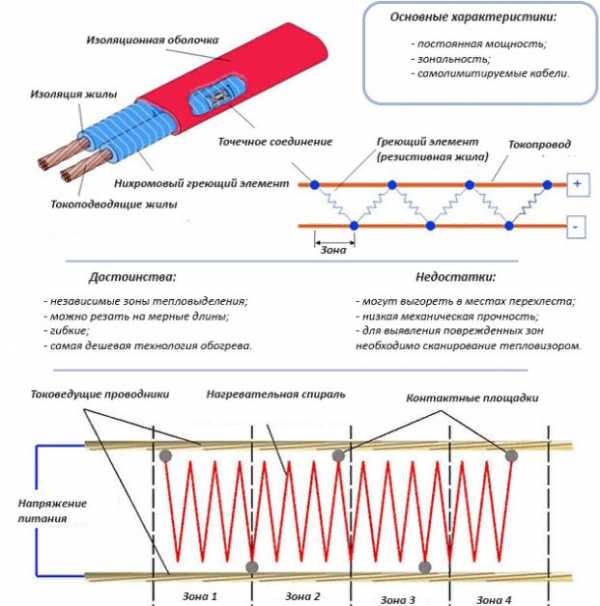 - Резистивный. Принцип действия такого кабеля основан на свойствах металлов выделять тепло при прохождении электрического тока. Главный недостаток резистивного кабеля – он работает независимо от внешних параметров. Неважно, какая температура на улице, резистивный всегда греется на полную мощность, потребляя большое количество электроэнергии. Для уменьшения расходов в схему часто включают температурные датчики и терморегуляторы.