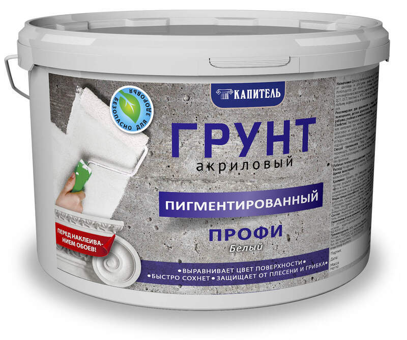 - Акриловая. Этот грунт состоит из акриловых полимеров и является универсальным. Применяется для нанесения на стены из гипсокартона, дерева, бетона, краски, асбоцемента, штукатурки.