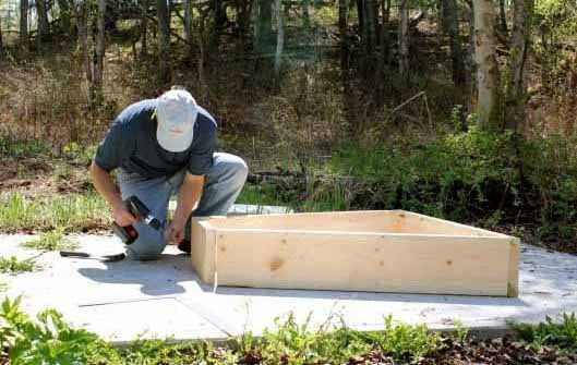 - Мастерим саму коробку, соединяем при помощи саморезов и шуруповерта установленные колышки и доски (если мы делаем коробку из досок) или другой имеющийся материал.