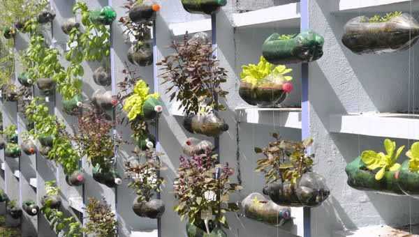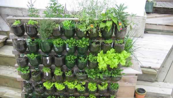 Есть много неожиданных вариантов вертикальных грядок, когда идут в ход пластиковые бутылки. Например, в крышке каждой из бутылок делают отверстия и поливают только верхний и средний ряды грядки, в нижние вода поступает из отверстий в крышках бутылок.