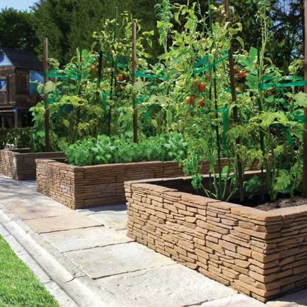 Чтобы грядка из камней привлекательно смотрелась, следует брать ровный материал или специальную огнеупорную плитку одинаковых размеров. В таких конструкциях отлично выращиваются помидоры или огурцы, поскольку благодаря высоте сооружения растения смогут получить максимальное количество солнечного света.