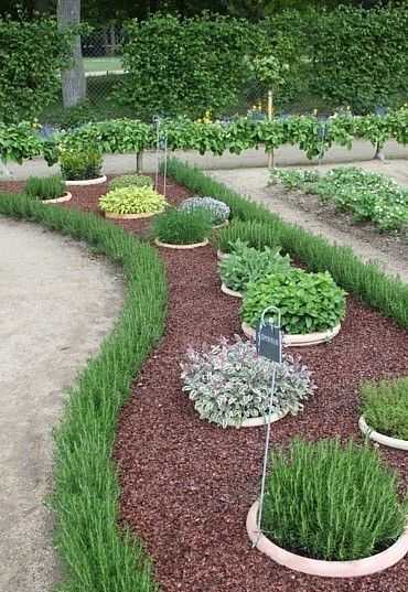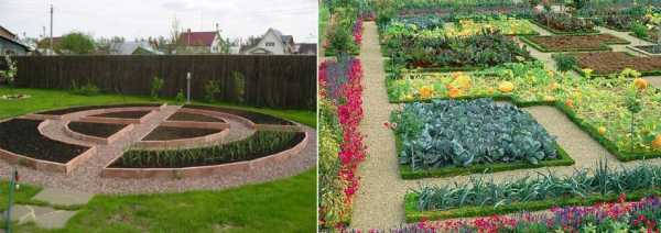 Такие грядки можно создавать так же в виде кругов или сегментов, в стиле французского сада. В этом случае грядки расходятся лучами от середины, а растения в них высажены рядами, где в каждом ряду — отдельный сорт растения.