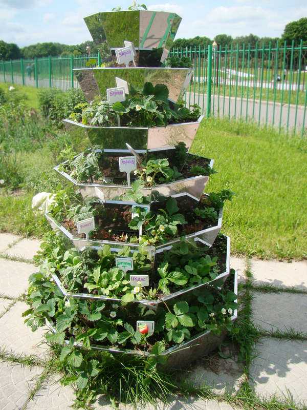 При создании подобной грядки важно не преувеличить количество посадочных площадок на одном крепеже. Оптимальный вариант – до 5 ярусов.
