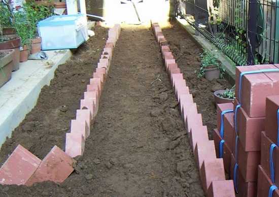 - Выполнение разметки (ширина около 40 см), выравнивание и утрамбовка грунта. Основание накрывают черной пленкой или геотекстилем.