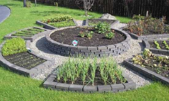 Интересное решение с формой и размерамиВот несколько интересных примеров красивых грядок и клумб своими руками, которые можно комбинировать на участках и огородах: