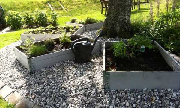 Между такими стационарными грядками целесообразно насыпать дорожки из гравия ( как легко сделать дорожку из гравия своими руками, можно прочитать в этой статье) Новые, специально купленные для этого дачного дизайна доски, желательно предварительно обработать — отшлифовать, если это требуется, пропитать септиком и покрыть древесным лаком или краской для дерева.