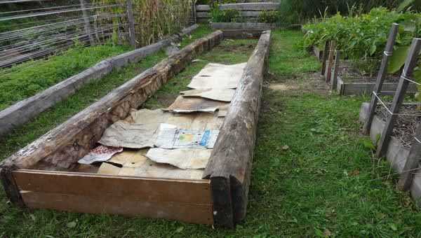 Внутри конструкции поверх веток нужно разложить куски картона или газеты. Благодаря такому решению удастся защитить грядку от сорняков в течение первого года выращивания растений. После этого можно приступать к заполнению конструкции почвой. Ее можно купить в любом садовом магазине или же сделать самостоятельно (садовая земля + органическое удобрение + торф, пропорция – 2:1:1).