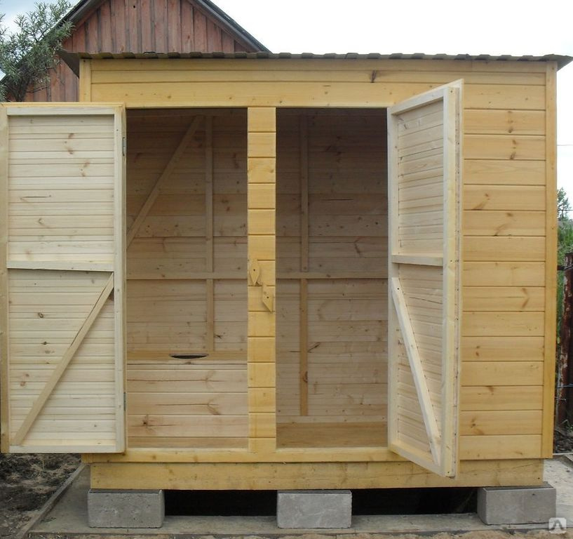Стены каркаса обшиты деревянной вагонкой. Доска может быть установлена вертикально или горизонтально по желанию владельца. Внутри отсека хозблока, отведенного под навес, на пол укладывают лаги, а настил делают из шпунтованной доски. В туалете сбивается стульчак, полы так же застилаются доской. Пол душевой кабины можно забетонировать или установить поддон из акрила с готовым сливом. Окончание работы – крепление дверей с петлями и установка окон.