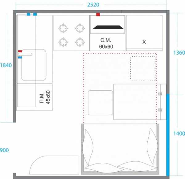 Второй вариант несколько сложнее и потребует хорошего технического исполнения. Основной проблемой тут является то, что сливы далековато расположены от канализационной трубы. Двери лучше будет заменить раздвижными, а стол — журнальным столиком, который на ночь необходимо будет выносить из кухни.