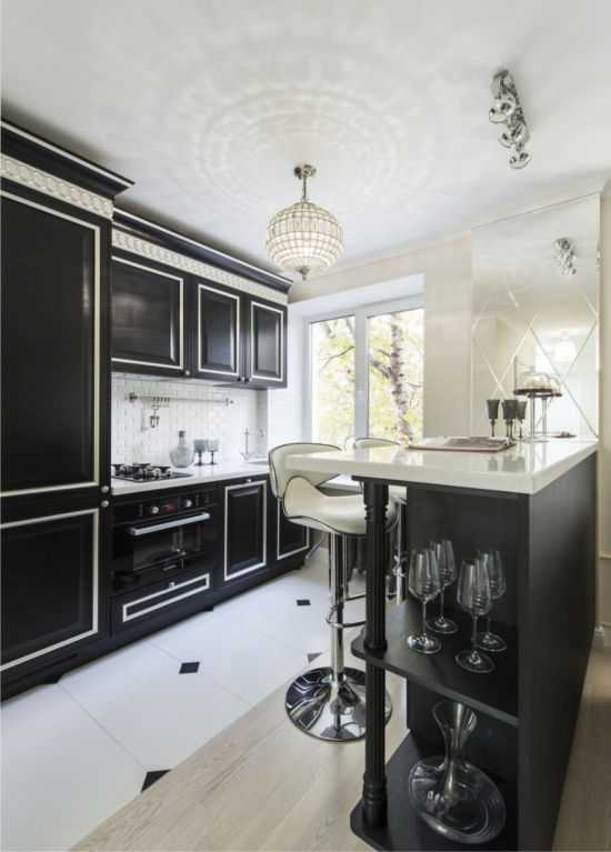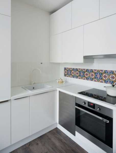 Для этого уместна встроенная техника, только самая необходимая и функциональная. Подоконник (при небольшом выносе) может послужить небольшим кухонным столиком.