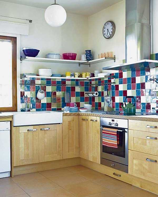 Для наиболее подверженной загрязнениям зоны, что располагается над плитой, лучше всего подходит декор с пёстрым рисунком.
