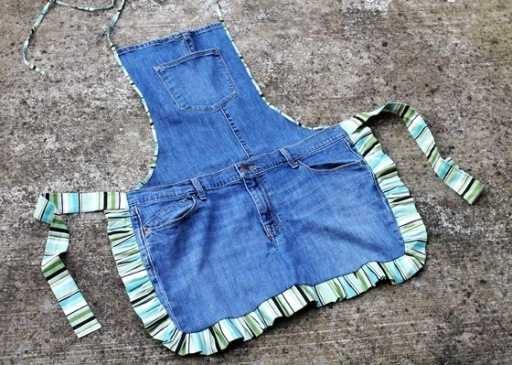 Некоторые мастера любят использовать джинсовые карманы и шлейки для отделки фартука. Также детали от одежды, которую уже не носят, можно использовать в оформлении передника.
