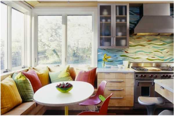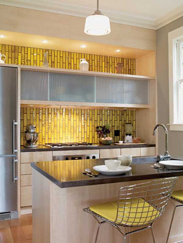 Это решение очень подходит кухням, в которых доминирует коричневая или светло-серая палитра. Обратите внимание на то, как освежает интерьер этот изумительный жёлто-синий орнамент.