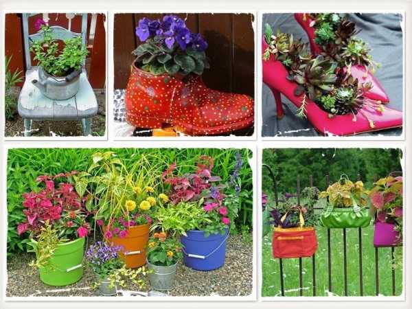 Кроме того, можно красиво оборудовать подвесные корзины для ампельных цветов, организовать для них же высокие вазоны. Или высадить неприхотливые виды в самые неожиданные емкости.