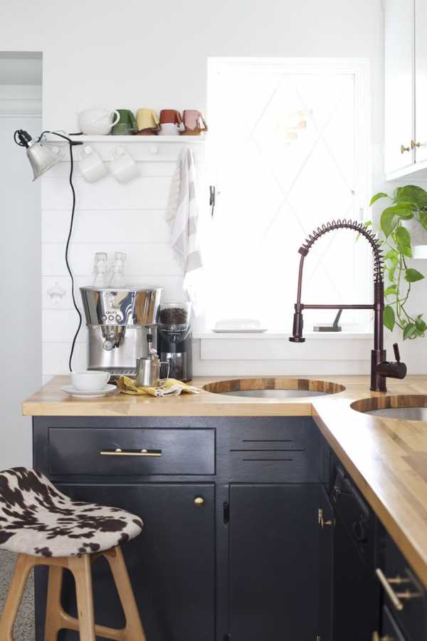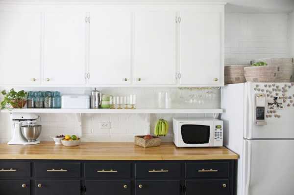 Затем шпаклевкой по дереву заполнила отверстия от ручек, ямки и другие неровности. После того как шпаклевка полностью высохла, она занялась шлифовкой пока поверхность не стала идеально гладкой. После этого ящики и отдельные части были готовы под покраску. На латунные ручки, конечно, пришлось разориться, но результат того стоит. Верхние шкафчики покрашены белой краской, нижние – черной. Такое цветовое решение делает пространство интересней и визуально не ограничивает.