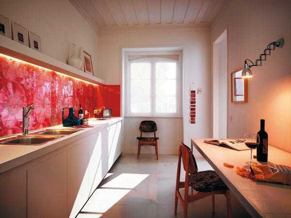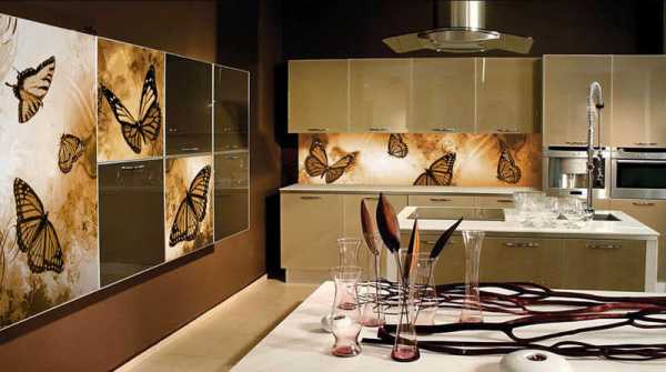 Необычный кухонный фартук, выполненный из стекла, может стать ярким украшением всего интерьера