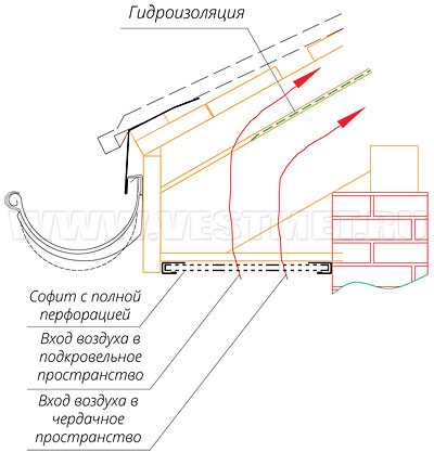 На рисунке 2 приведен пример использования полностью перфорированного софита для варианта холодной кровли из металлочерепицы с обрывом гидроизоляции на карнизном свесе.