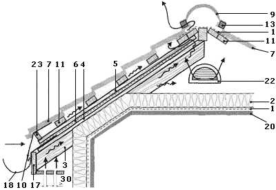 1 – слой пароизоляции; 2 – материал утеплителя; 3 – стропила; 4 – обрешетка промежуточная; 5 – контробрешетка; 6 – пленка гидроизоляции; 7 – листы металлочерепицы; 9 – конек крыши; 10 – карниз кровли; 11 – обрешетка; 13 – слой уплотнителя; 17 – доска карнизная; 20 – потолок; 22 – решетка вентиляции; 23 – начальная обрешетка