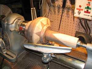 Второй этап заключается в том, чтобы изготовить заготовку (из обрезки полена или бруска дерева квадратного сечения). Это может производиться в режиме 1000−1500 оборотов в минуту. В этом случае стружка должна сниматься справа налево посредством желобчатой вогнутой широкой стамески для предварительной обработки рейера. Если заготовка длинноватая, то черновая обработка осуществляется в несколько шагов; подручник при этом придвигается к детали по мере ее отделки, не меняя положения по высоте.