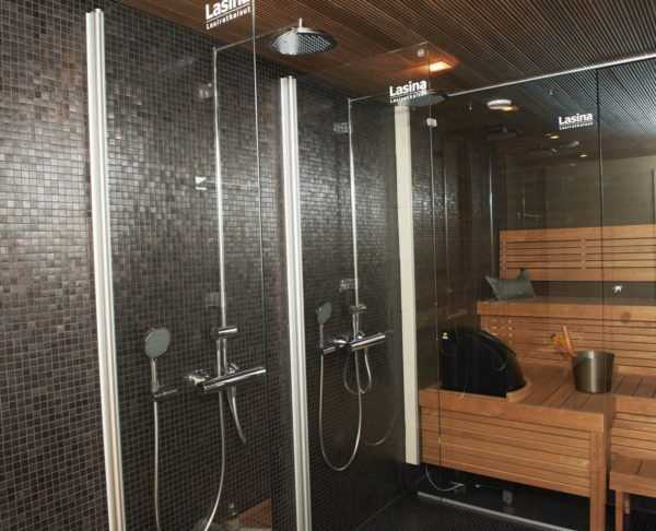 Вообще, если зона отдыха или предбанник — это отличное поле для экспериментов, то в дизайне душевой «разгуляться» не получится. Так что внешний вид будет зависеть в основном от того, какую плитку и какую сантехнику мы выберем.