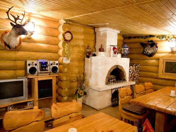 Классический и самый популярный вариант – это русская баня. Комната отдыха в исконно русском стиле характеризуется лаконичностью и простотой: деревянные стены без дополнительной отделки, массивная кирпичная печь, большой деревянный стол и обычные скамейки, лавки. Такой стиль часто выбирают те, кто строит баню из бруса или оцилиндрованного бревна, т. к. в этом случае можно не делать внутреннюю отделку.