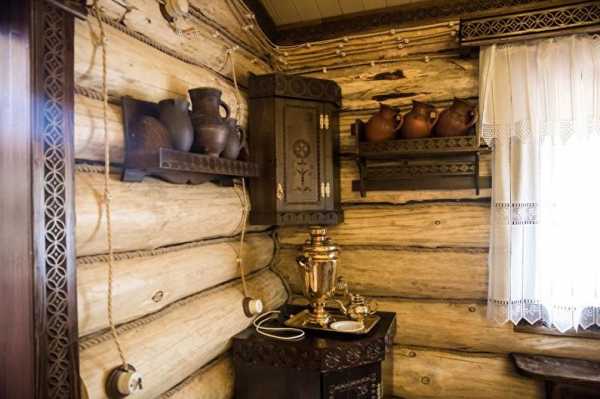 В качестве элементов декора применяются вышитые шторы на окнах, вязаные коврики, деревянная посуда, самовар.
