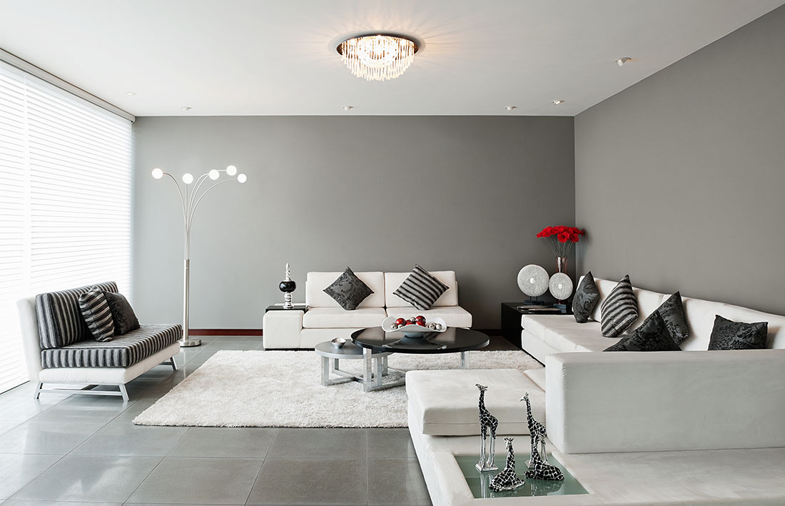 В комнате с белыми обоями мебель должна быть контрастной, пол и потолок желательно выкрасить в яркие или темные тона. На диван можно положить красивые подушки, которые станут изюминами интерьера.