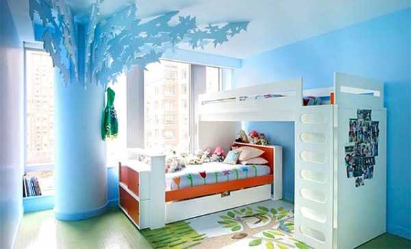 Спальня для мальчика и девочки вместе дизайнОчень интересным вариантом размещения кроватей является использование подвесных моделей. Такой вариант обычно используется для маленьких комнат, в этом случае спальные места на день просто поднимаются к стене, освобождая пространство для игр. Для больших комнат используются кровати с подвесной системой, которая крепится к потолку. Обычно это очень интересные интерьеры в сказочном, морском или других стилях. Такое решение делает пространство необычным и привлекательным, создающем уютную атмосферу