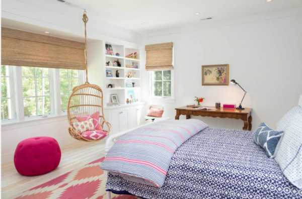Дизайн комнаты для девочки подростка 12 лет в холодных цветах чем-то напоминает интерьер в прибрежном доме: развешанные по стенам керамические тарелки с живописной росписью, плетеная мебель, кашпо с цветами, светлого цвета паркет.