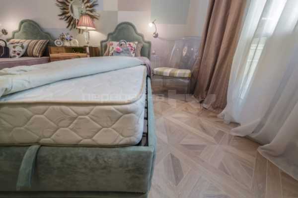 У противоположной стены — две кровати с изголовьями в стиле рококо — они сделаны в форме морской раковины, обиты велюровой тканью, закрепленной декоративными мебельными гвоздиками.
